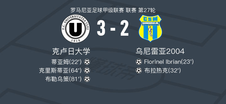北京时间2月17日罗马尼亚足球甲级联赛 联赛 第27轮,克卢日大学主场对阵乌尼雷亚2004。克卢日大学蒂亚姆破门,克里斯蒂亚破门,布勒乌策破门。乌尼雷亚2004Florinel Ibrian破门,布拉热克破门。最终比分克卢日大学 3-2 乌尼雷亚2004。