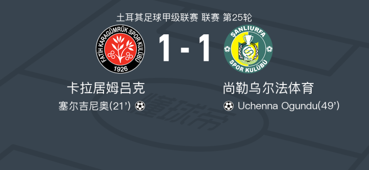 北京时间2月18日土耳其足球甲级联赛 联赛 第25轮,卡拉居姆吕克主场对阵尚勒乌尔法体育。卡拉居姆吕克塞尔吉尼奥破门。尚勒乌尔法体育Uchenna Ogundu破门。最终比分卡拉居姆吕克 1-1 尚勒乌尔法体育。