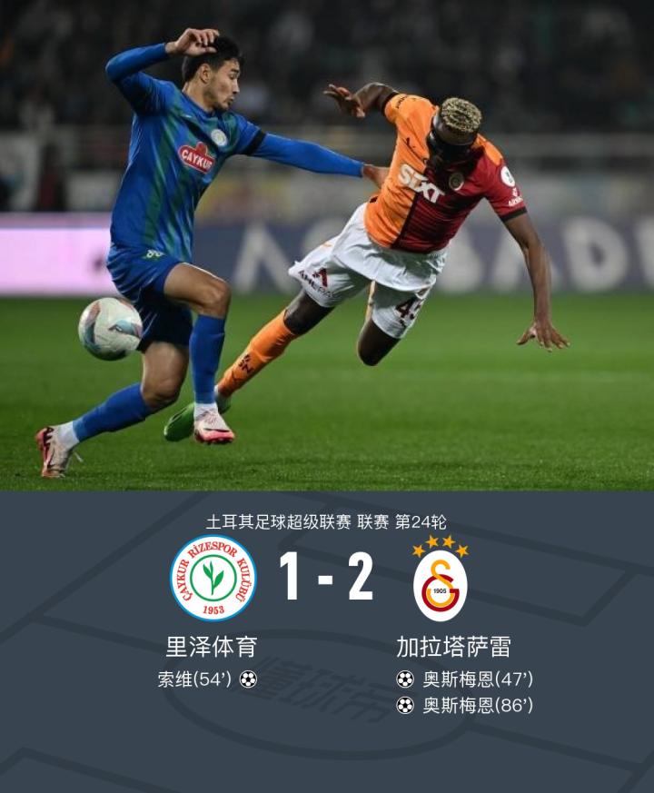 加拉塔萨雷2-1客胜里泽体育6分领跑,奥斯梅恩双响+绝杀