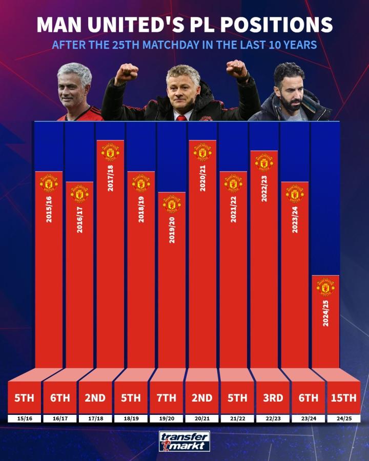 近10个赛季曼联英超前25轮过后排名:两次第2,今年第15shuchori @懂球帝2025-02-18 10:19北京时间2月18日,德国转会市场官网账号盘点了近10个赛季曼联在英超前25轮战罢之后的排名情况。本赛季英超前25轮战罢,曼联仅取得了8胜5平12负的成绩,积29分暂列积分榜第15位,领先降级区12分。从近十个赛季的成绩来看,目前排名第15位是曼联近十个赛季以来在英超前25轮过后的最差排名,曼联曾在2017-18赛季和2020-21赛季两次在前25轮过后排名联赛次席。展开更多