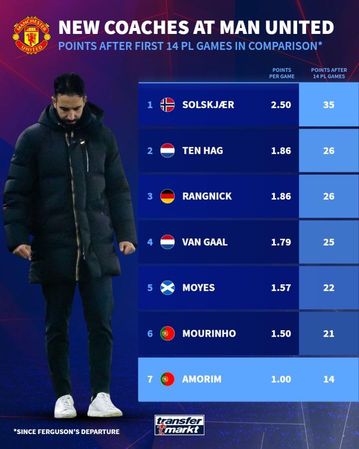 弗格森后曼联新帅前14轮英超场均拿分:阿莫林1分垫底