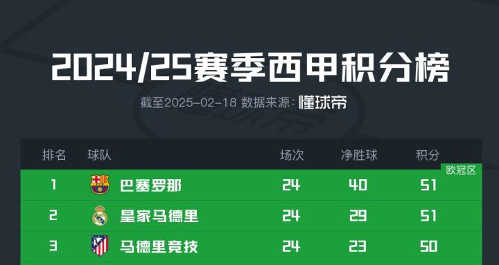 根据统计,在有20支球队参加的西甲联赛中,这是历史上第三次在24轮比赛后前三名的球队仅相差一个积分。
