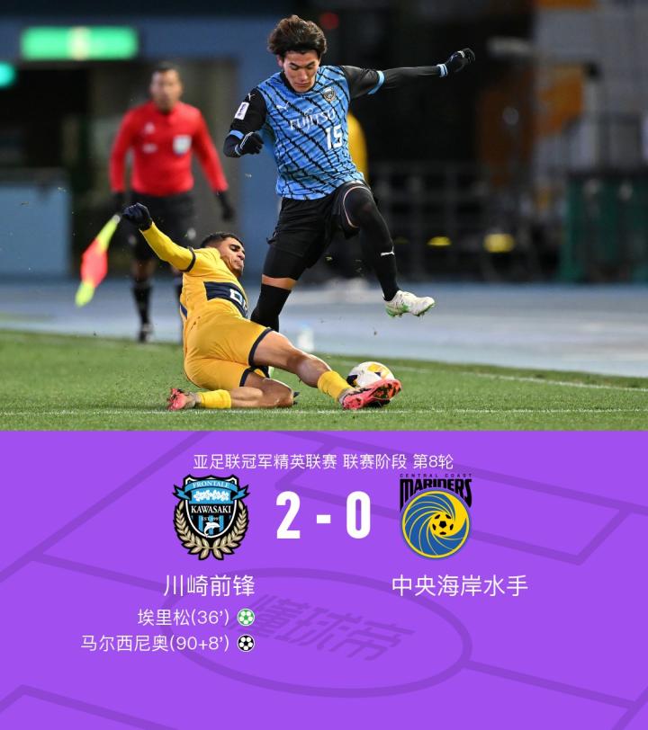 北京时间2月18日亚足联冠军精英联赛联赛阶段第8轮,川崎前锋对阵中央海岸水手。川崎前锋埃里松点射建功,马尔西尼奥最后时刻破门。最终川崎前锋2-0中央海岸水手五连胜晋级淘汰赛。