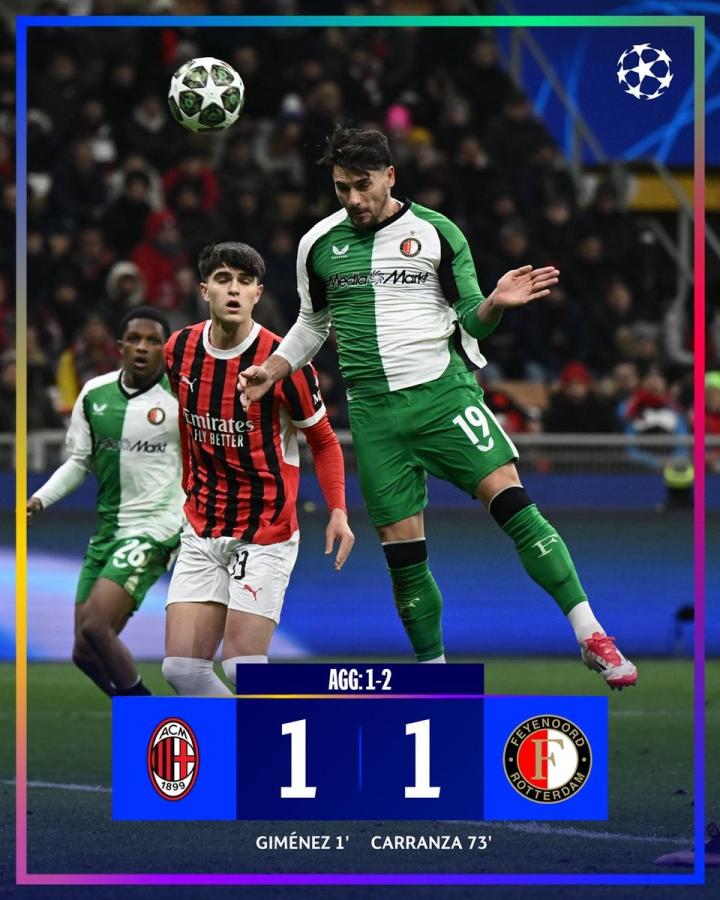 此役客场对阵米兰,开场第1分钟先丢一球的费耶诺德在多一人作战后凭借卡兰萨破门扳平比分,最终1-1战平对手,以总比分2-1淘汰米兰,晋级欧冠16强。