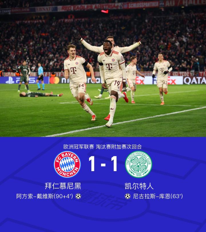 北京时间2月19日欧洲冠军联赛淘汰赛附加赛次回合,拜仁慕尼黑对阵凯尔特人。上半场,凯恩射门击中横梁弹出,格雷罗门线贡献关键解围。下半场,拜仁后防出现失误,库恩破门将总比分扳平。读秒阶段,格雷茨卡冲顶被扑出,阿方索-戴维斯跟进破门。全场比赛结束,拜仁1-1战平凯尔特人,以两回合3-2的总比分晋级欧冠16强。