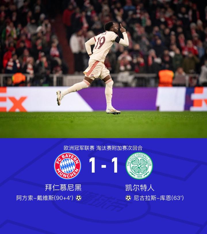 【拜仁总比分3-2凯尔特人晋级16强,戴维斯读秒绝杀,凯恩中框】