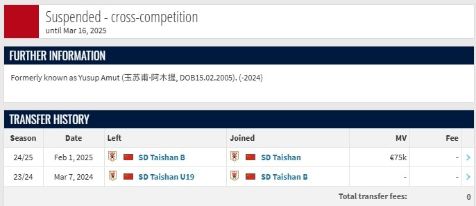 去年12月,中国足协纪律委员会发布公告,宣布对年龄造假的球员谢木西丁做出禁赛处罚,禁赛时间从2024年12月17日持续至2025年3月16日,但当时在各支国内球队的名单里都找不到叫这个名字的球员。而根据德转最近更新的信息,这名球员就是玉苏甫-阿木提。