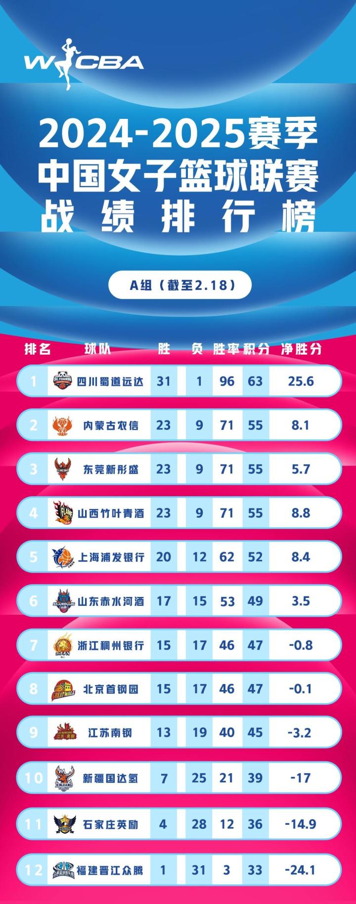 2024-2025赛季WCBA联赛常规赛昨日落下帷幕,最终排名也正式揭晓。四川女篮以31胜1负的成绩稳居A组榜首,而武汉女篮则以出色表现位居B组第一。
