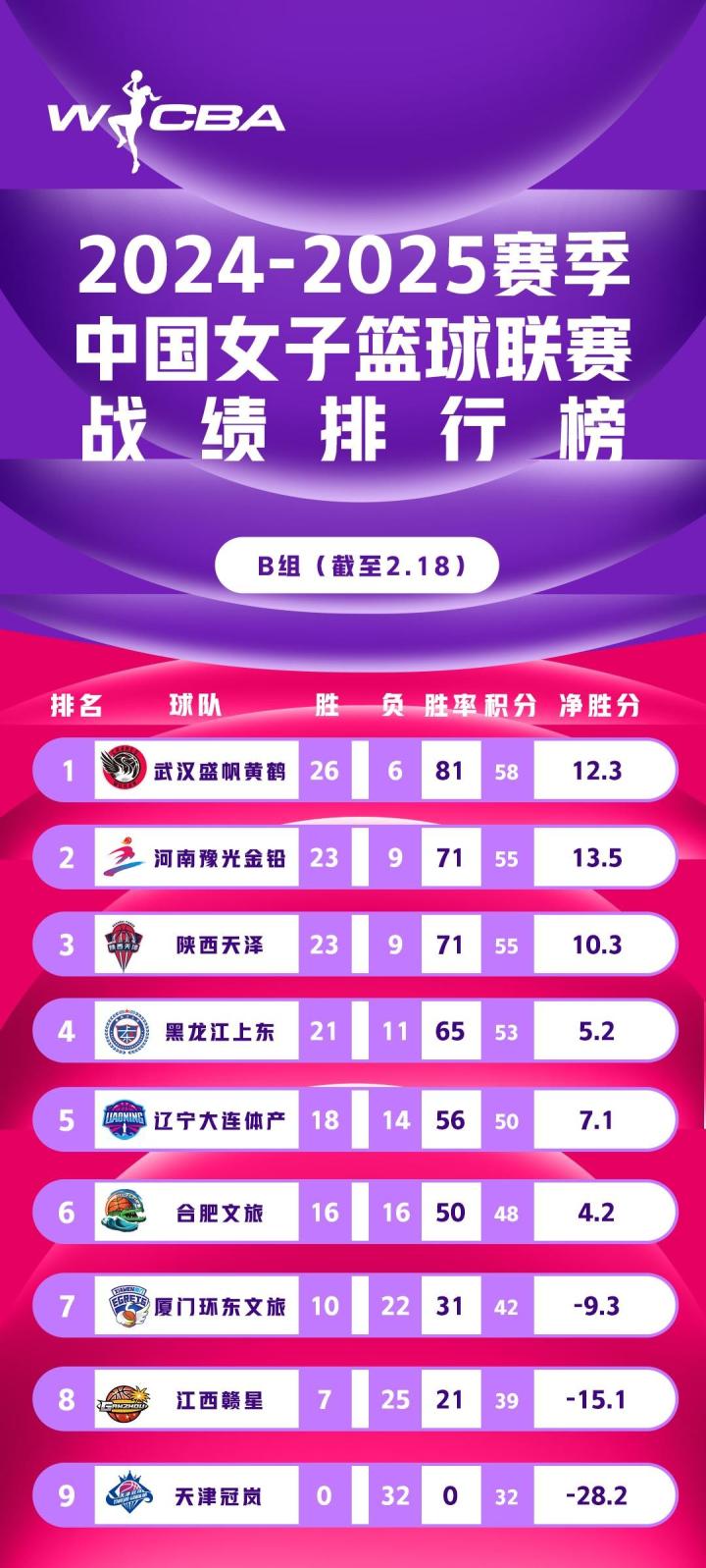 B组:1.武汉女篮(26胜6负),2.河南女篮(23胜9负),3.陕西女篮(23胜9负)4.黑龙江女篮(21胜11负),5.辽宁女篮(18胜14负),6.合肥女篮(16胜16负),7.厦门女篮(10胜22负),8.江西女篮(7胜25负),9.天津女篮(0胜32负)