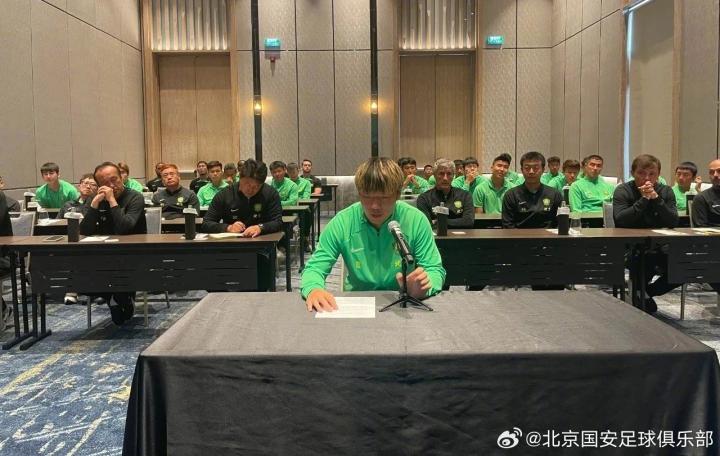 周金辉董事长的发言鼓舞了全队的士气,队长张稀哲随后代表全体队员发言,他说:“新教练组的到来重塑了我们的足球思维,起初或许有磨合的阵痛,但现在,我们清晰感受到——这支团队的心跳得更快、更齐了。我们也将在主教练的带领下,同心协力,一切以团队为先,集体为先。遵守队规,遵守赛风赛纪,坚守职业道德。身披绿色战袍的这些年,工体山呼海啸的呐喊早已刻进骨髓。我们记得球迷在场内坚毅又期待的目光,记得数以万计的绿色围巾,更记得一次次场内tifo给予我们的力量。新赛季的倒计时已经响起!我们会像捍卫家门一样守护每一寸球场。没有保留,没有退路,唯有将每一分钟燃烧到极致——为了北京,为球迷,更为了我们的信仰,“国安永远争第一”!”