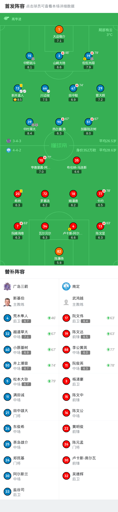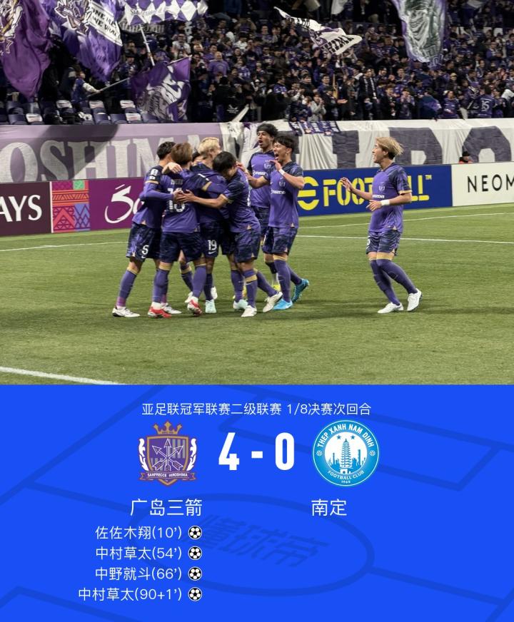 北京时间2月19日亚足联冠军联赛二级联赛 1/8决赛次回合,广岛三箭对阵南定。广岛三箭佐佐木翔破门,中村草太梅开二度,中野就斗破门。最终比分广岛三箭 4-0 南定。两回合总比分广岛三箭7-0南定。