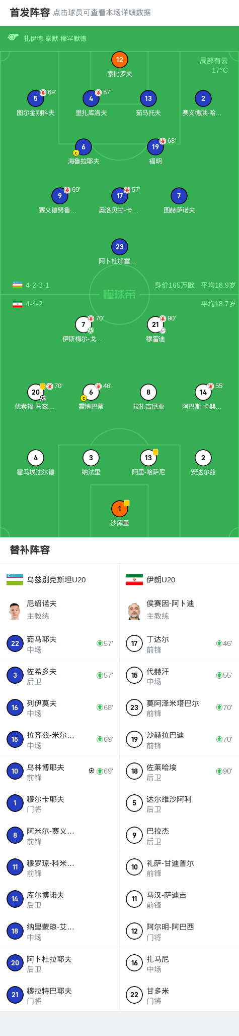 第52分钟,马兹拉埃一脚远射,索比罗夫脱手送礼,U20伊朗1-0领先