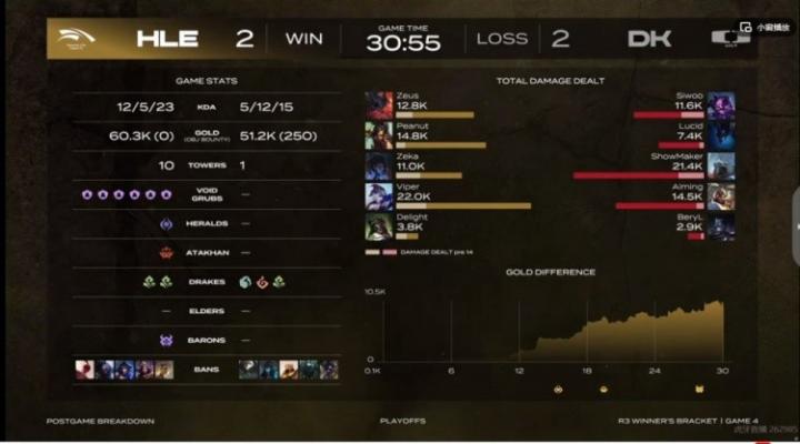 第15分钟,HLE上路抓ShowMaker,DK支援收掉Zeus,随后双方野区拉扯,DK打出1换3,4-5。