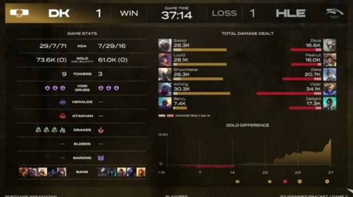 第35分钟,DK开大龙,HLE想抓Siwoo,Peanut反而先行被击杀DK打出0换3拆掉上路高地塔后想撤退,HLE追击留人反被DK再收四人,DK顺势推上高地拆掉水晶扳平比分,17-29。