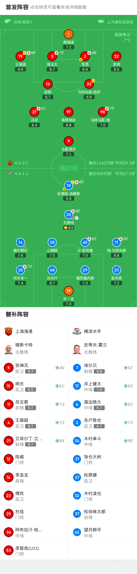 北京时间2月19日亚足联冠军精英联赛阶段第8轮,上海海港对阵横滨水手。上半场,莱昂纳多补射入网被判越位进球无效,天野纯远射被颜骏凌倒地扑出;下半场,李昂疑似因伤离场,天野纯助攻植中朝日破门,天野纯门前用肩膀将球顶进,古斯塔沃甩头攻门被扑住。最终比分上海海港 0-2 横滨水手。