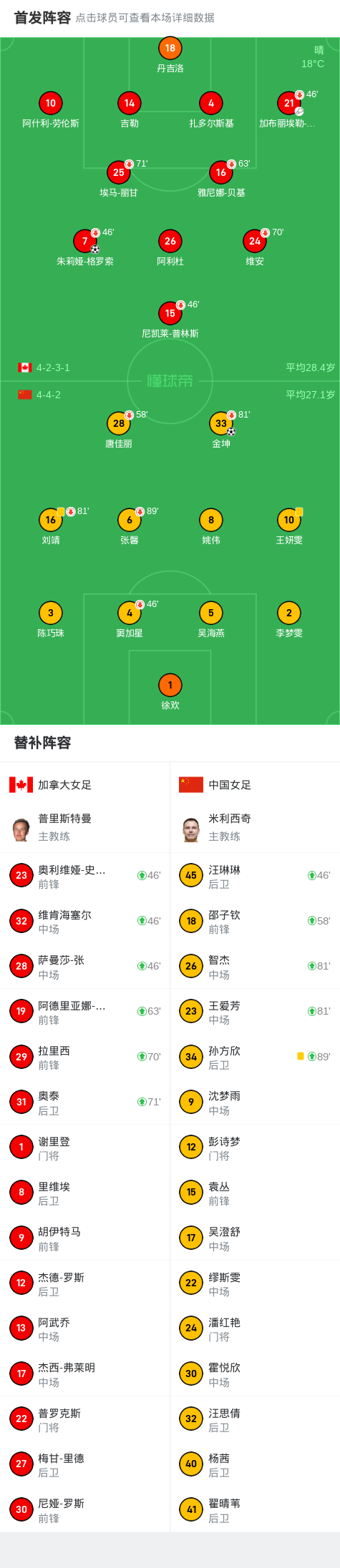 第16分钟,朱莉娅-格罗索右路前插推射远角破门,加拿大女足1-0