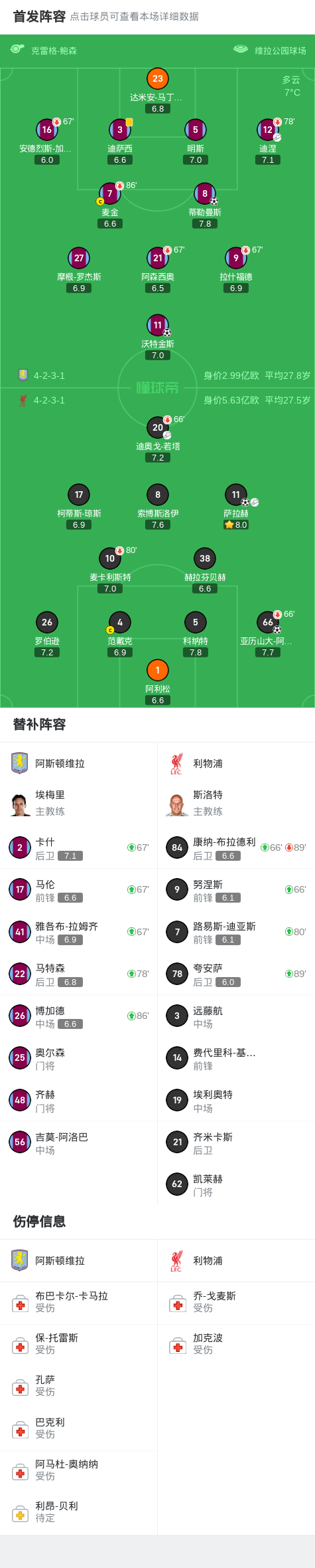 剑南春 | 利物浦客场2-2维拉,沃特金斯破门,萨拉赫传射建功