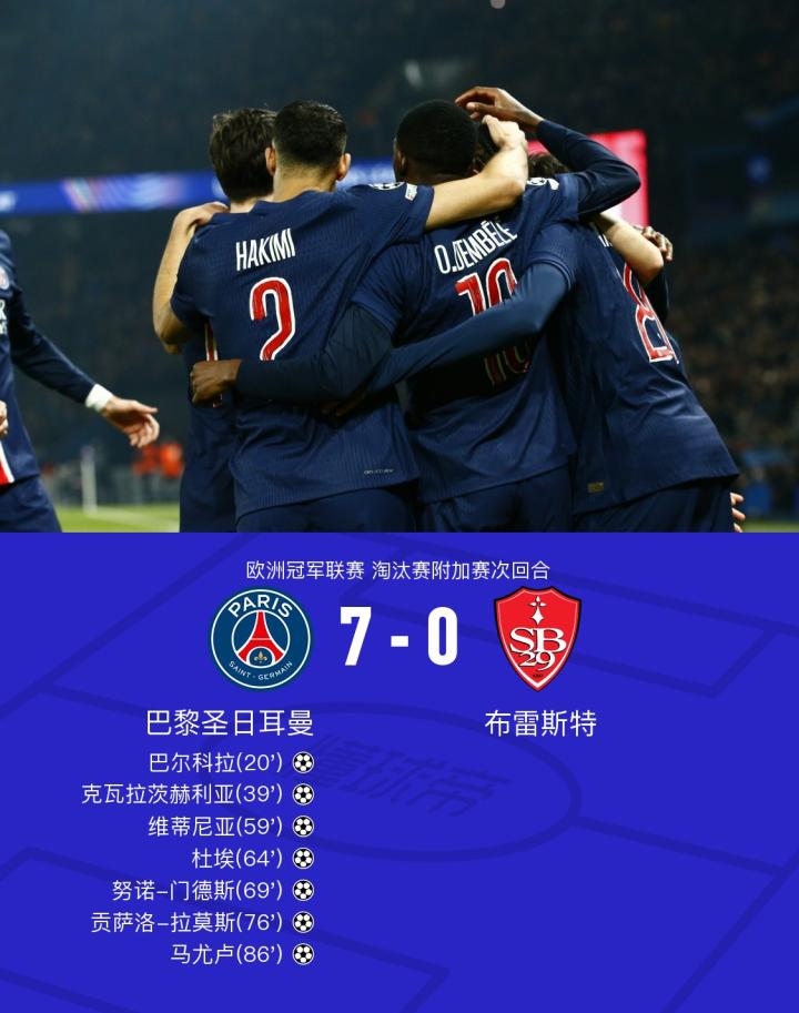 北京时间2月20日欧洲冠军联赛 淘汰赛附加赛次回合,巴黎圣日耳曼对阵布雷斯特。比赛上半场巴尔科拉禁区调整推射近角率先拔得头筹,克瓦拉茨赫利亚后点小角度包抄铲射破门。下半场巴黎攻势不减,维蒂尼亚禁区前兜射破门,贡萨洛-拉莫斯与杜埃替补连线相互完成传射,阿什拉夫也助攻努诺-门德斯推射空门得手。比赛尾声由KK送出助攻,马尤卢破门锁定比分。最终比分巴黎圣日耳曼 7-0 布雷斯特。两回合总比分巴黎圣日耳曼10-0布雷斯特。