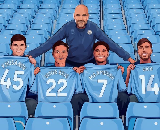 在一周前的首回合较量中,瓜迪奥拉的战术选择非常保守,放弃中场堆前锋的策略未能达成目标,几位新援在替补席上目睹了球队的失利。三天后在同一块场地对阵纽卡斯尔,瓜迪奥拉的战术来到了另一个极端,胡桑诺夫、尼科-冈萨雷斯和马尔穆什出现在中轴线上。曼城依靠长传战术化解了埃迪-豪祭出的盯人防守,马尔穆什利用哈兰德的掩护,成功上演帽子戏法。