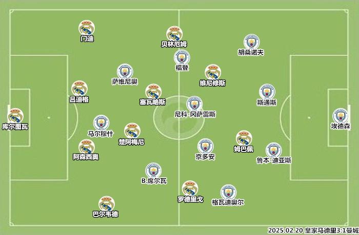 系列赛的悬念在上半场结束时便已经终结,双方的控球率(50%-50%)和传球次数(236-238)方面相差无几,皇马在射门次数(7-1)和创造绝对机会(3-0)方面取得了压倒性优势。曼城无法控制比赛的原因是强度不足,瓜迪奥拉对京多安和伯纳多-席尔瓦的位置安排导致中场无法起速,马尔穆什和萨维尼奥面对劳尔-阿森西奥和吕迪格毫无优势可言。