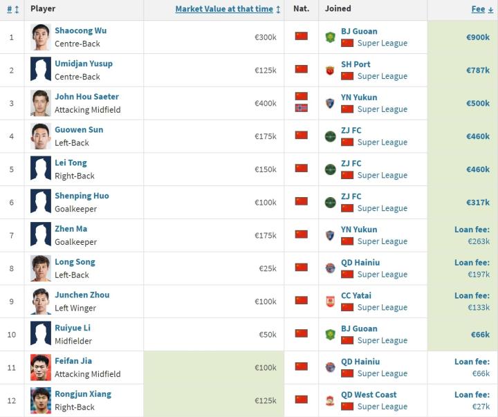 中超国内球员转会榜:共12笔产生费用,吴少聪成标王