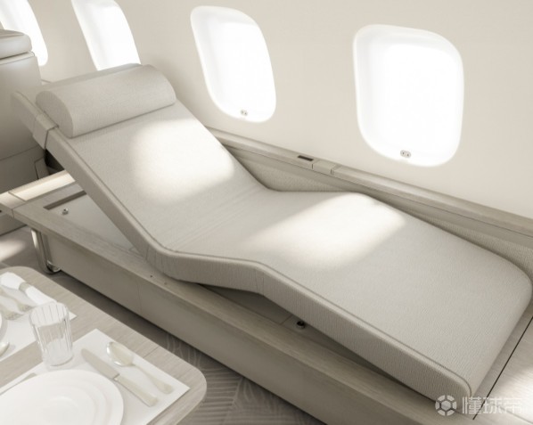 与机组人员房间分开的是会议套房,里面有一张高度可调节的桌子和一个梳妆台,该私人套房设有获得专利的Nuage零重力座椅,让乘客能在飞行途中坐下来放松身心。