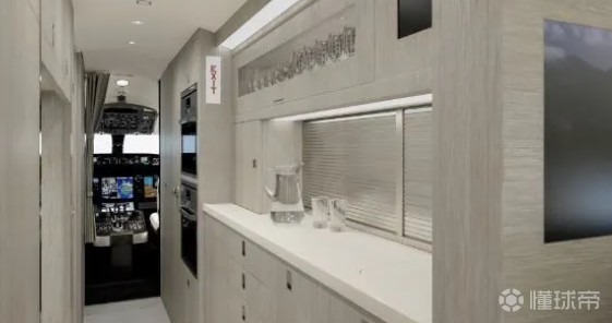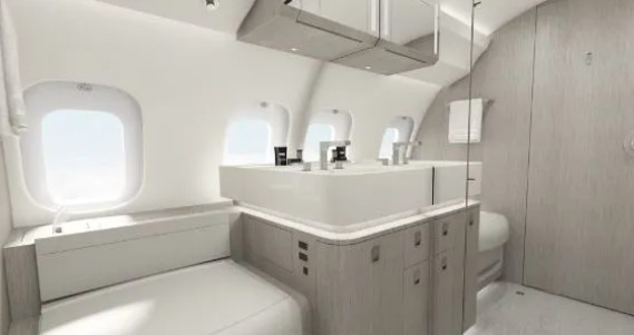 另外,这款飞机上有多个套房供乘客使用,入口和机组人员房间设有一个豪华厨房,配备烤箱、微波炉,甚至还有浓缩咖啡/咖啡机,公共浴室配有大镜子、梳妆台、水槽和水龙头,乘客会有一个宽敞的衣柜来存放个人物品。