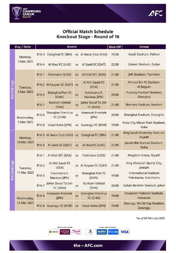 北京时间2月20日,亚足联官网公布了亚冠精英赛淘汰赛的赛程。其中,上海海港将于3月4日与11日先主后客面对横滨水手,而上海申花则将分别于3月5日与12日先主后客面对川崎前锋。