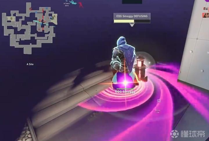 第8回合,EDG进攻A区,Kamo神鬼不觉回防找到多人位置,Smoogy宇宙分裂开启不及遭团灭,3-5。EDG叫出暂停。