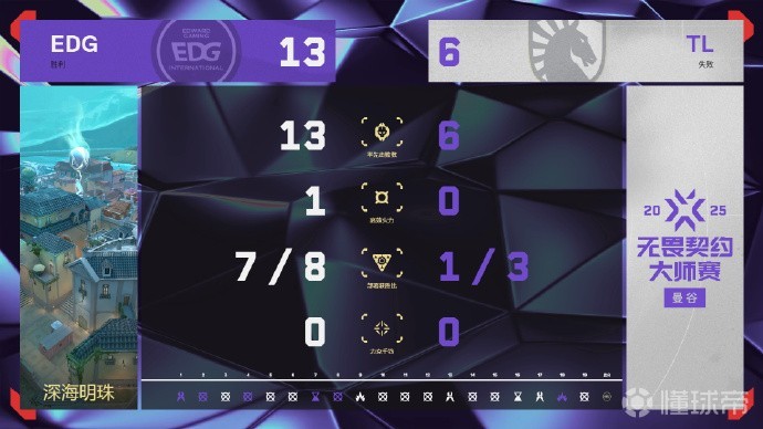 上半场手枪局,EDG进攻方开局,TL摆铺收获奇效,Keiko和kamo中路推进团灭EDG,0-1(以下比分均EDG在前)。