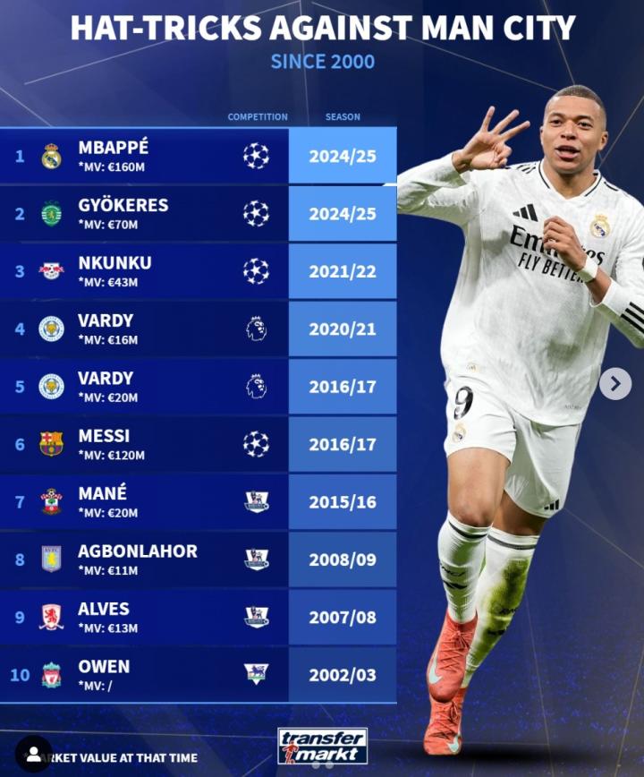 在皇马3-1击败曼城的比赛中,姆巴佩上演了帽子戏法。据德转统计,姆巴佩是本世纪第九位对阵曼城完成帽子戏法的球员。