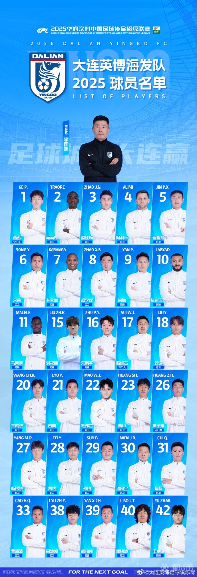 今日,大连英博足球俱乐部官方发布了球队本赛季一线队球员名单,毛伟杰、朱鹏宇两位国青小将在列,新援马莱莱身穿11号球衣。
