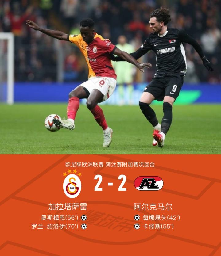 北京时间2月21日欧足联欧洲联赛 淘汰赛附加赛次回合,加拉塔萨雷对阵阿尔克马尔。加拉塔萨雷奥斯梅恩破门,罗兰-绍洛伊破门。阿尔克马尔每熊晟矢破门,卡修斯破门。最终比分加拉塔萨雷 2-2 阿尔克马尔。两回合总比分加拉塔萨雷3-6阿尔克马尔。