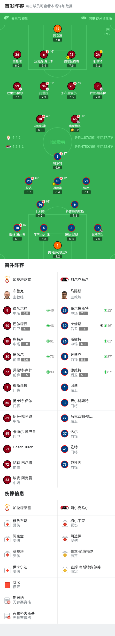 第70分钟,加拉塔萨雷球员巴里什-伊尔马兹助攻罗兰-绍洛伊打入一球。