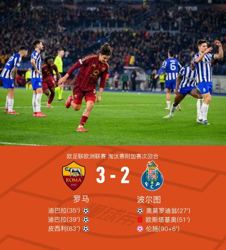 北京时间2月21日欧足联欧洲联赛 淘汰赛附加赛次回合,罗马对阵波尔图。上半场罗迪翁精彩倒钩破门,之后迪巴拉连入两球反超比分。下半场欧斯塔基奥无球状态下击打帕雷德斯,VAR介入后裁判出示直红,之后安赫利尼奥倒三角,皮西利破门扩大比分,补时阶段伦施自摆乌龙。最终罗马3-2战胜波尔图,两回合总比分4-3晋级16强。