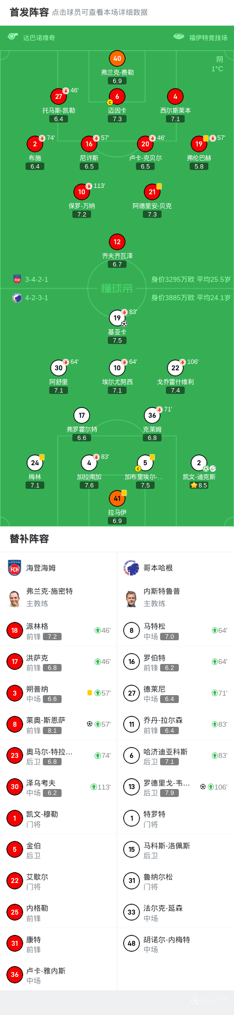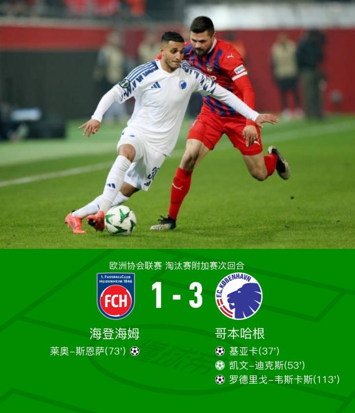 总比分海登海姆3-4哥本哈根,基亚卡破门,韦斯卡斯建功