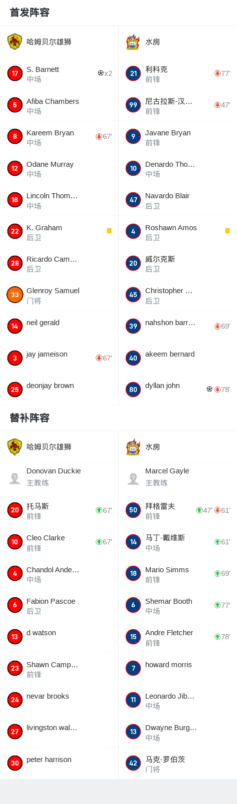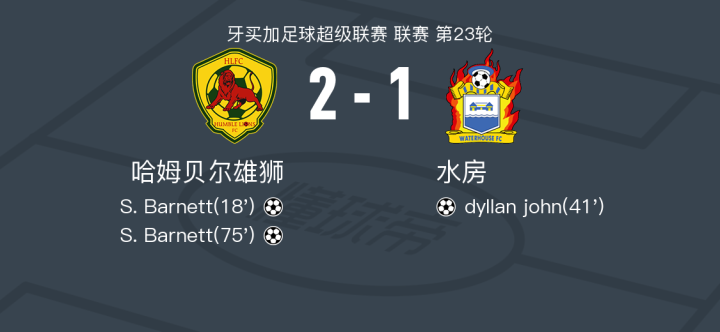 北京时间2月21日牙买加足球超级联赛 联赛 第23轮,哈姆贝尔雄狮主场对阵水房。哈姆贝尔雄狮S. Barnett梅开二度。水房dyllan john破门。最终比分哈姆贝尔雄狮 2-1 水房。