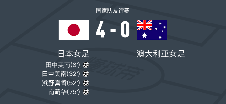 北京时间2月21日国家队友谊赛,日本女足对阵澳大利亚女足。日本女足田中美南梅开二度,浜野真香破门,南萌华破门。最终比分日本女足 4-0 澳大利亚女足。