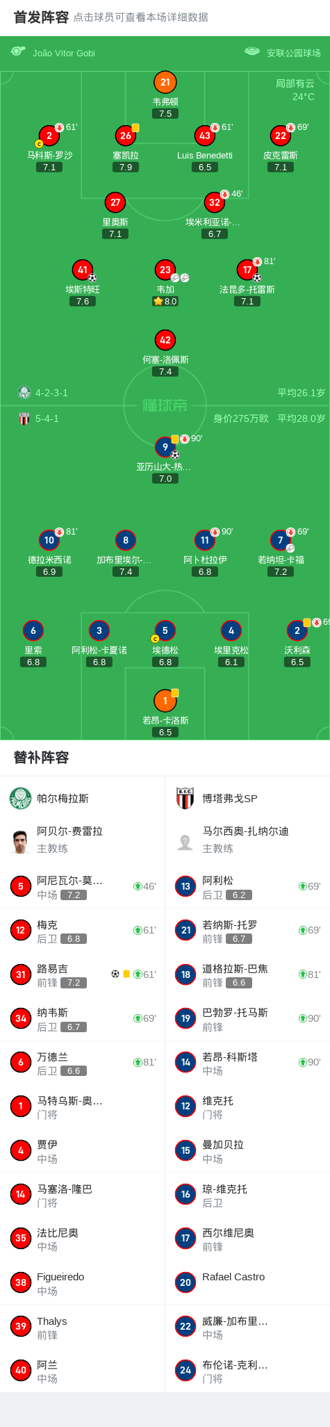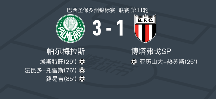 北京时间2月21日巴西圣保罗州锦标赛 联赛 第11轮,帕尔梅拉斯主场对阵博塔弗戈SP。帕尔梅拉斯埃斯特旺破门,法昆多-托雷斯破门,路易吉破门。博塔弗戈SP亚历山大-热苏斯破门。最终比分帕尔梅拉斯 3-1 博塔弗戈SP。