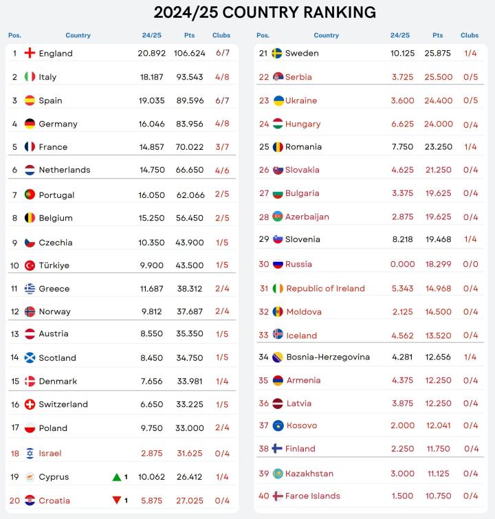 2024-25赛季三级欧战十六强出炉,如今在欧战积分上英超继续领跑,意甲西甲德甲紧随其后,排名5-7位的则是法甲荷甲与葡超。