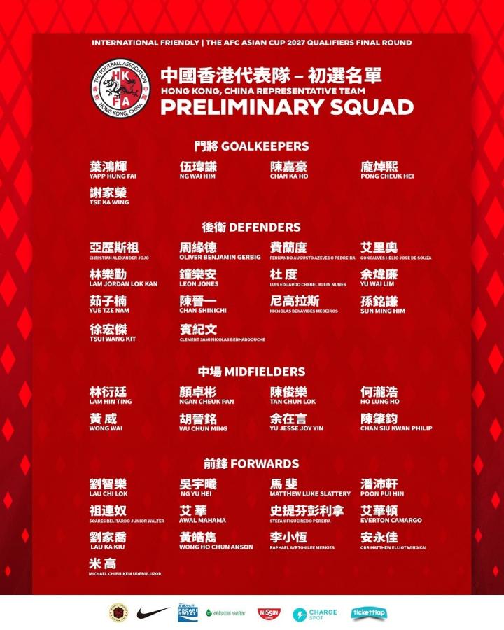 北京时间2月21日,中国香港足球总会公布了中国香港代表队3月亚洲杯预选赛初选名单。
