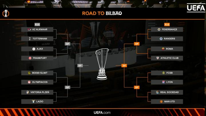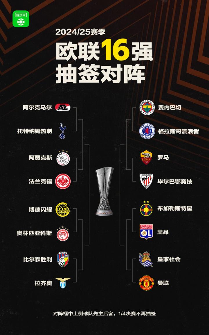 欧联1/8决赛对阵:曼联vs皇家社会;热刺vs阿尔克马尔知春路卡里乌斯 @懂球帝2025-02-21 20:21北京时间2月21日20点,24-25赛季欧联1/8决赛抽签仪式在瑞士尼翁进行,目前抽签结果已经出炉。抽签结果奥林匹亚科斯vs博德闪耀格拉斯哥流浪者vs费内巴切阿贾克斯vs法兰克福里昂vs布加勒斯特星托特纳姆热刺vs阿尔克马尔曼联vs皇家社会拉齐奥vs比尔森胜利毕尔巴鄂竞技vs罗马展开更多