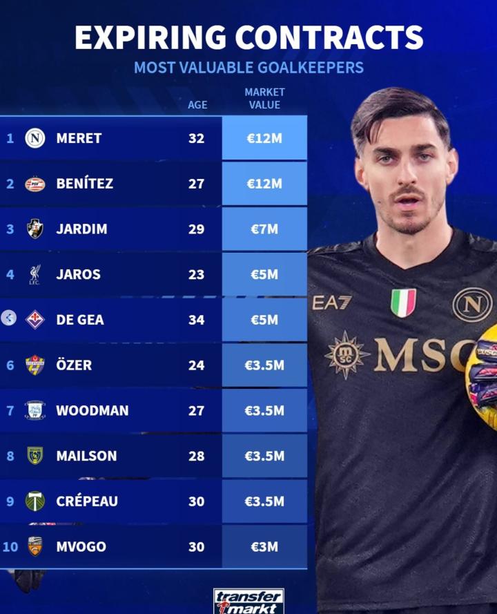 德国足球转会市场统计了今年合同就要到期的门将,列出了他们的身价情况,其中,那不勒斯门将梅雷特和埃因霍温贝尼特斯居首,德赫亚在列。