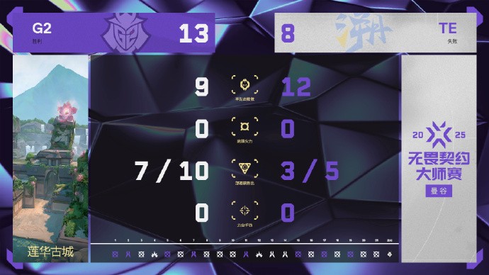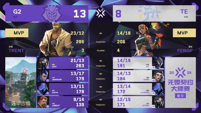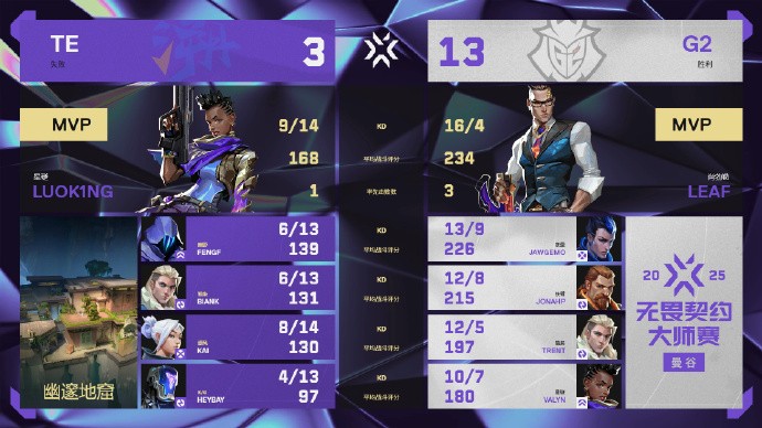 北京时间2月21日,无畏契约曼谷大师赛瑞士轮继续进行,CN赛区2号种子TE溯0-2负于美洲赛区1号种子G2。TE在自己的选图莲华古城中屡次遭到对手存钱翻盘,痛失好局,在图二中则毫无还手之力,最终落入0-1组。