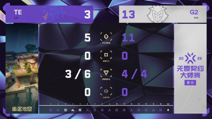 此后,G2叫出暂停彻底激活状态,连续拿下7分,TE被打得毫无还手之力,战术不奏效,枪感也不断下滑,3-9落后。