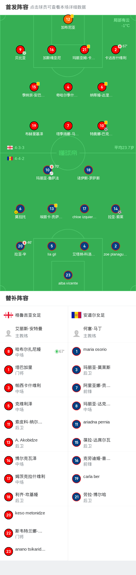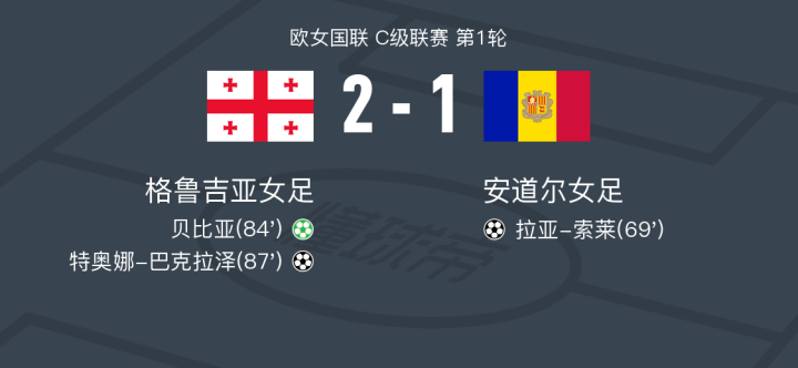 北京时间2月21日欧女国联 C级联赛 第1轮,格鲁吉亚女足对阵安道尔女足。格鲁吉亚女足贝比亚破门,特奥娜-巴克拉泽破门。安道尔女足拉亚-索莱破门。最终比分格鲁吉亚女足 2-1 安道尔女足。
