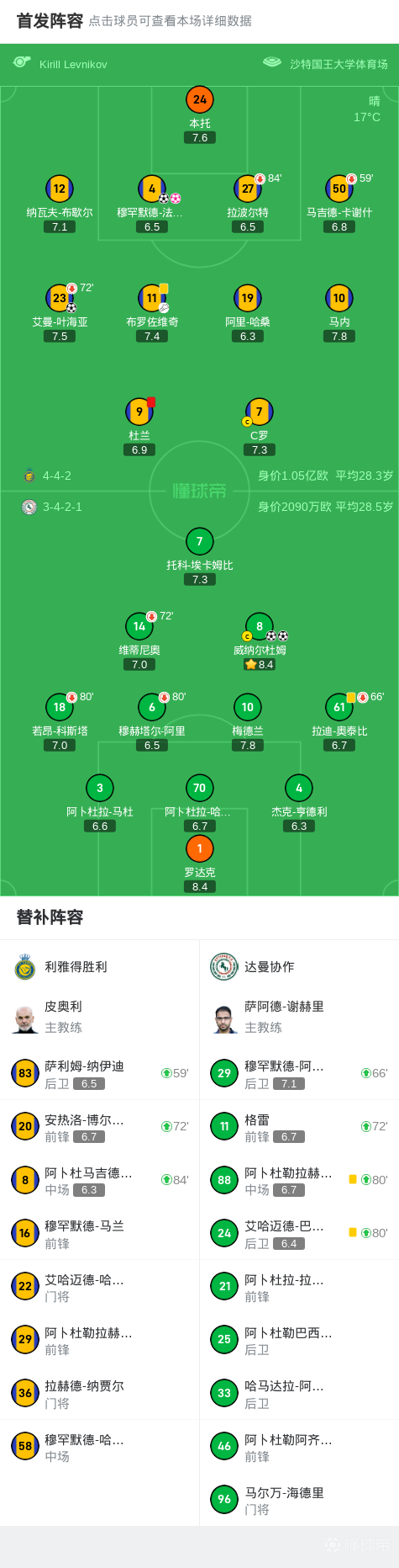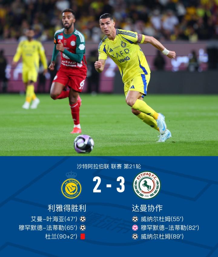 北京时间2月22日沙特联第21轮,利雅得胜利主场对阵达曼协作。上半场,两队均无建树。下半场,马内助攻叶海亚破门。威纳尔杜姆随后扳平比分,法蒂勒的头槌帮助胜利再次反超,但是随后法蒂勒自摆乌龙。比赛尾声阶段,威纳尔杜姆劲射帮助客队逆转比分,杜兰击打对手头部被红牌罚下。全场比赛结束,十人胜利主场2-3惨遭达曼协作逆转。