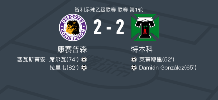 北京时间2月22日智利足球乙级联赛 联赛 第1轮,康赛普森主场对阵特木科。康赛普森塞瓦斯蒂安-席尔瓦破门,拉里韦破门。特木科莱蒂耶里破门,Damián González破门。最终比分康赛普森 2-2 特木科。