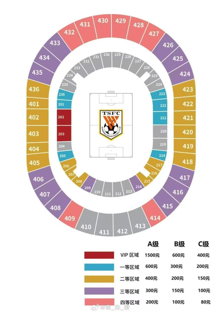 新赛季山东泰山主场比赛的球票按看台位置被分为VIP、一等、二等、三等以及四等这五大区域,其中各个区域又被分为A级、B级以及C级三个票价。
