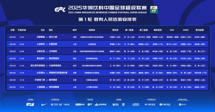 2025中超首轮比赛裁判安排如下:
